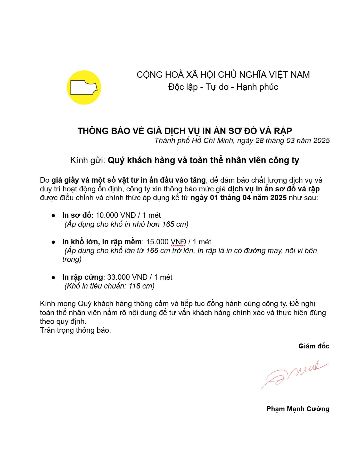 Nhằm đảm bảo chất lượng dịch vụ và duy trì hoạt động ổn định trong bối cảnh giá giấy và một số vật tư in ấn đầu vào tăng cao, chúng tôi xin trân trọng thông báo về việc điều chỉnh giá dịch vụ in ấn sơ đồ và rập. Mức giá mới sẽ chính thức được áp dụng kể từ ngày 01 tháng 04 năm 2025, cụ thể như sau: